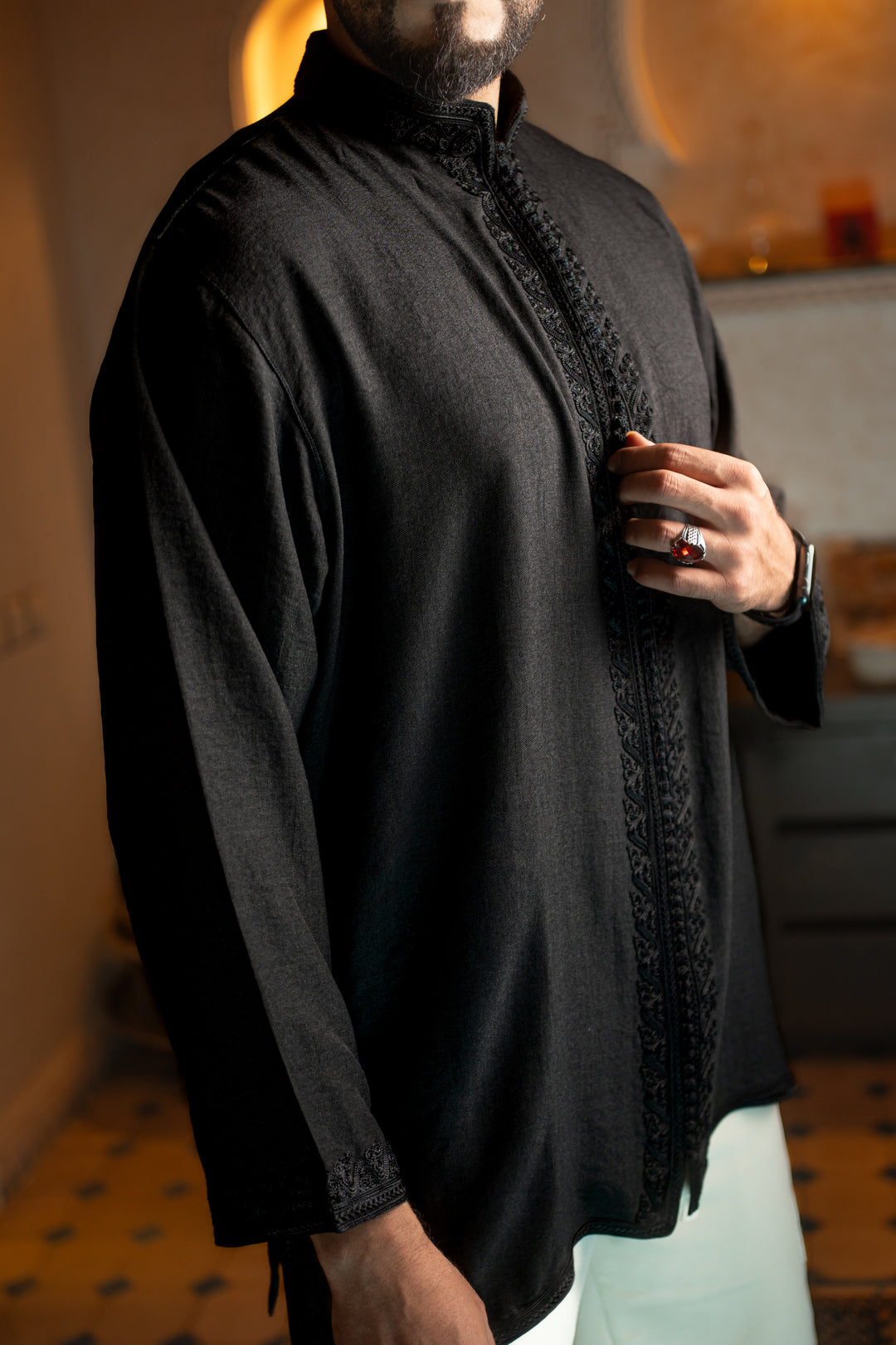Intricate sfifa and delicate beadwork from collar to cuff, including along the sleeves. The Tonika Original is a tribute to Moroccan artistry stitched by hand.
